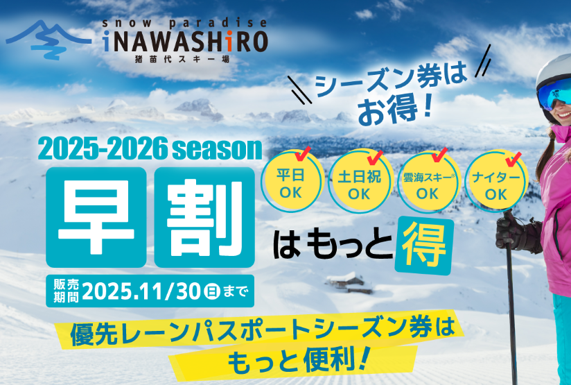 猪苗代スキー場は2025-26シーズンもリフト券価格据え置き、早割シーズン券が最高にオトクです。